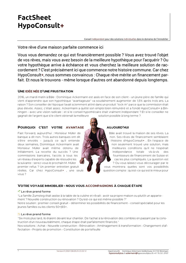 HypoConsult+ ist ein unabhängiges Beratungsunternehmen für Immobilienfinanzierungen, gegründet 2016 von Dominique Ackermann in Binningen.